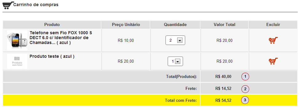 2) Caso deseje excluir algum produto, clique no carrinho com sinal de “menos” (-);